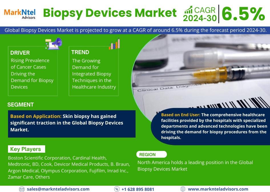 MarkNtel Advisors, a leading market research and consulting firm, has announced the release of its latest study titled Biopsy Devices Market Research Report: Forecast (2024–2030). This report provides a detailed assessment of the Biopsy Devices, covering its evolving dynamics, emerging trends, key growth drivers, major challenges, and competitive landscape.