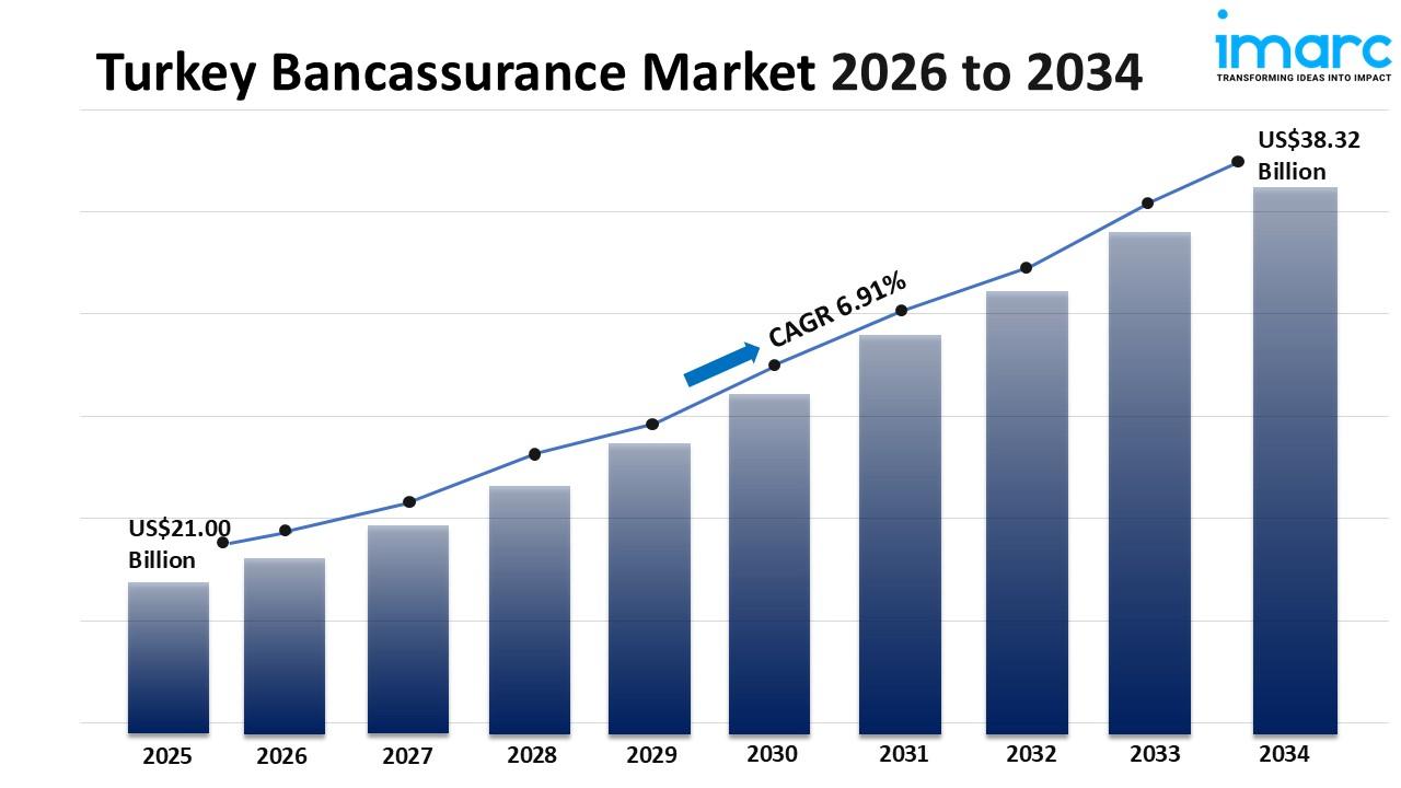 The Turkey bancassurance market was valued at USD 21.00 Billion in 2025 and is forecasted to reach USD 38.32 Billion by 2034, growing at a CAGR of 6.91% during the period from 2026 to 2034. The market growth is driven by banks expanding insurance offerings through their wide distribution networks and digital platforms, increasing insurance accessibility in urban and rural areas. Strategic partnerships, product diversification, and regulatory support also enhance growth in life, health, property, and investment-linked insurance.