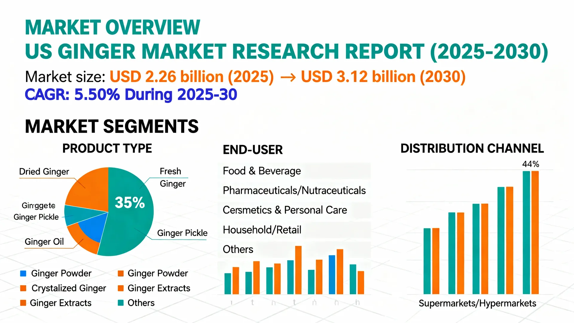 According to MarkNtel Advisors study The future of US Ginger Market size is valued at around USD 2.26 billion in 2025 and is expected to reach USD 3.12 billion by 2030. Along with this, the market is estimated to grow at a CAGR of around 5.50% during the forecast period, i.e., 2025-30.
