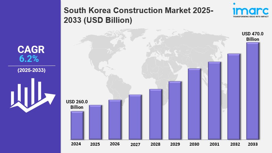 The South Korea construction market size was valued at USD 260.0 Billion in 2024 and is forecast to reach USD 470.0 Billion by 2033, exhibiting a CAGR of 6.2% during the 2025-2033 period. Key growth drivers include government initiatives, rapid urbanization, infrastructural development, technological advancements, and rising environmental concerns. Increasing foreign investments and political stability further support sustained growth in the construction sector.