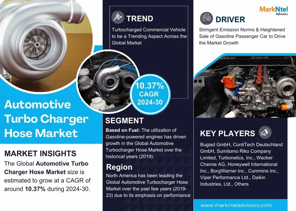 MarkNtel Advisors, a leading market research and consulting firm, has announced the release of its latest study titled Automotive Turbo Charger Hose Market Research Report: Forecast (2024–2030). This report provides a detailed assessment of the Automotive Turbo Charger Hose, covering its evolving dynamics, emerging trends, key growth drivers, major challenges, and competitive landscape.