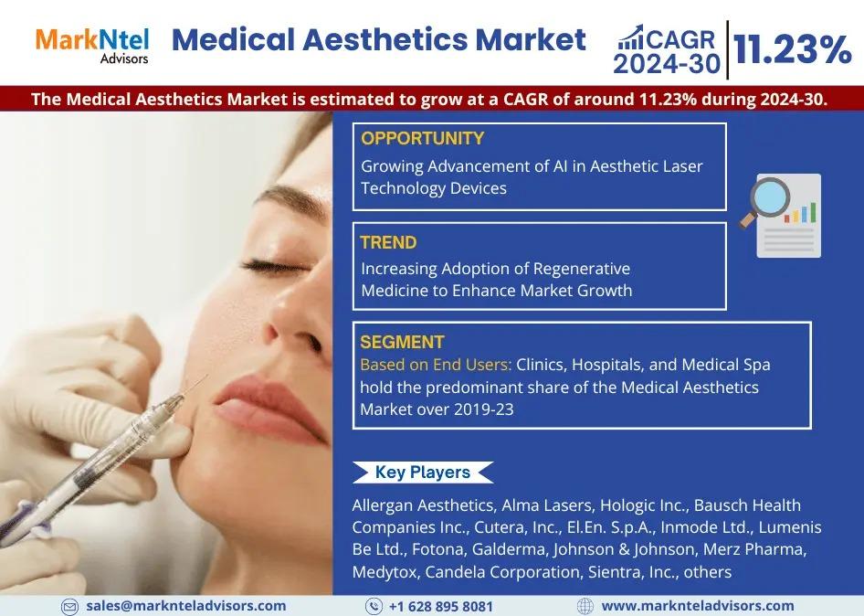MarkNtel Advisors, a leading market research and consulting firm, has announced the release of its latest study titled Medical Aesthetics Market Research Report: Forecast (2024–2030). This report provides a detailed assessment of the Medical Aesthetics, covering its evolving dynamics, emerging trends, key growth drivers, major challenges, and competitive landscape.