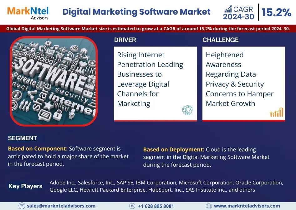 MarkNtel Advisors, a leading market research and consulting firm, has announced the release of its latest study titled Digital Marketing Software Market Research Report: Forecast (2024–2030). This report provides a detailed assessment of the Digital Marketing Software, covering its evolving dynamics, emerging trends, key growth drivers, major challenges, and competitive landscape.