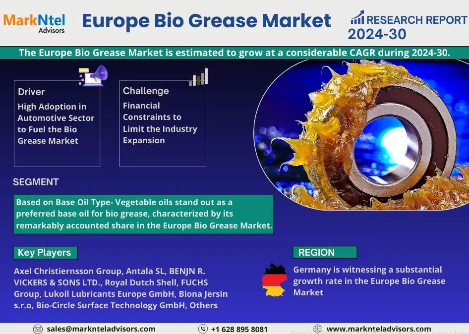 MarkNtel Advisors, a leading market research and consulting firm, has announced the release of its latest study titled Europe Bio Grease Market Research Report: Forecast (2024–2030). This report provides a detailed assessment of the Europe Bio Grease, covering its evolving dynamics, emerging trends, key growth drivers, major challenges, and competitive landscape.