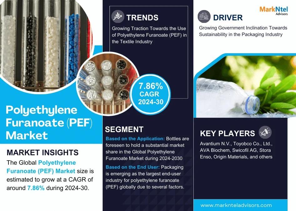 MarkNtel Advisors, a leading market research and consulting firm, has announced the release of its latest study titled Polyethylene Furanoate (PEF) Market Research Report: Forecast (2024–2030). This report provides a detailed assessment of the Polyethylene Furanoate (PEF), covering its evolving dynamics, emerging trends, key growth drivers, major challenges, and competitive landscape.