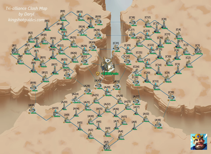 To excel in the Tri-Alliance Clash, understanding the map layout and strategic positioning is crucial. The map divides into three main zones, each anchored by a starting point at alliance headquarters located at positions a1, b1, and c1. Knowing your starting location helps tailor your approach for maximum effectiveness.