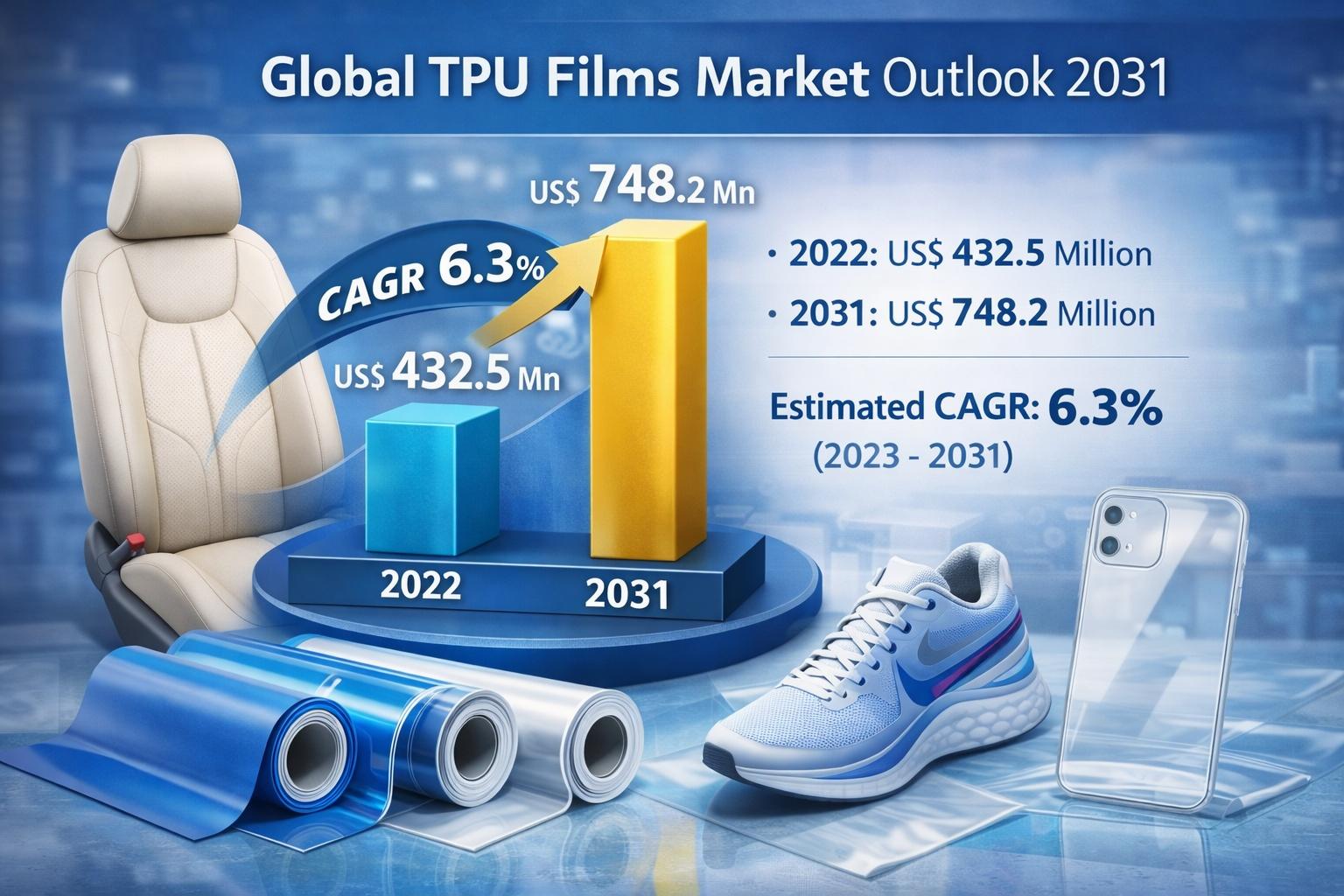 The global Thermoplastic Polyurethane (TPU) films market is gaining strong momentum as industries increasingly shift toward high-performance, durable, and versatile materials. Valued at US$ 432.5 million in 2022, the market is projected to reach US$ 748.2 million by 2031, expanding at a compound annual growth rate (CAGR) of 6.3% from 2023 to 2031. This steady growth reflects the rising adoption of TPU films across automotive, apparel, footwear, healthcare, electronics, and industrial applications.