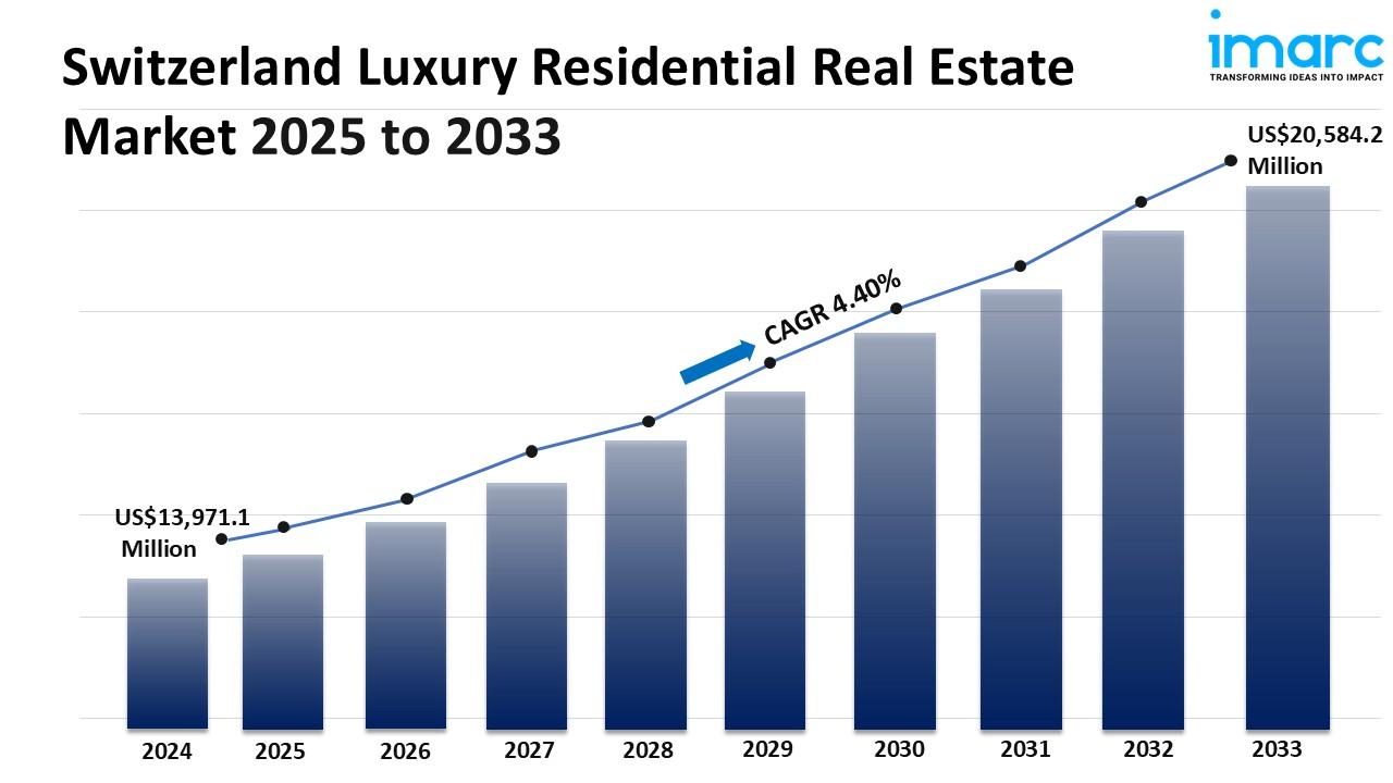 The Switzerland luxury residential real estate market size was valued at USD 13,971.1 Million in 2024. The market is projected to reach USD 20,584.2 Million by 2033, growing at a CAGR of 4.40% during the forecast period of 2025-2033. Growth is driven by rising high-net-worth individuals seeking privacy and stability, increased foreign investments, demand for eco-friendly homes, and technological integration in smart homes.