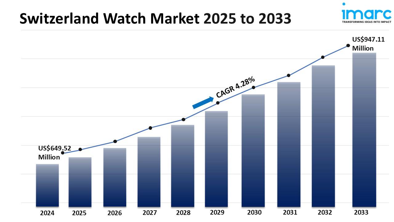 The Switzerland watch market size reached USD 649.52 Million in 2024 and is projected to grow to USD 947.11 Million by 2033. The market will expand at a CAGR of 4.28% during the forecast period 2025-2033. Driven by heritage craftsmanship, luxury branding, and evolving consumer demands, the market includes segments like mechanical and smartwatches. Distribution through retail and e-commerce channels enhances accessibility, while customization and sustainability gain importance among consumers.