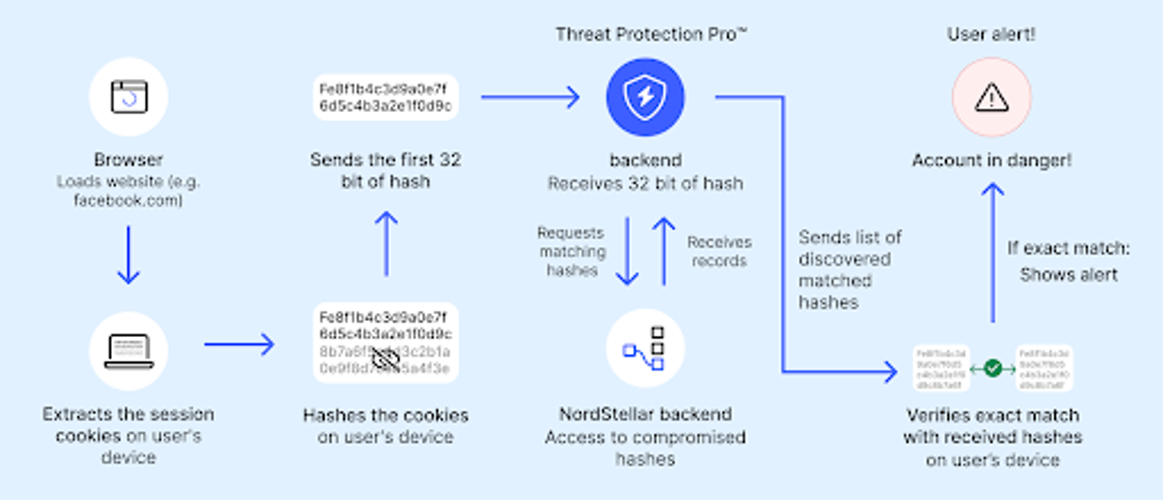 • A portion of that hash is checked against NordVPN’s threat intelligence index — Nordstellar — which catalogs roughly 130 billion compromised cookies gathered from continuous scans of the web and dark markets.