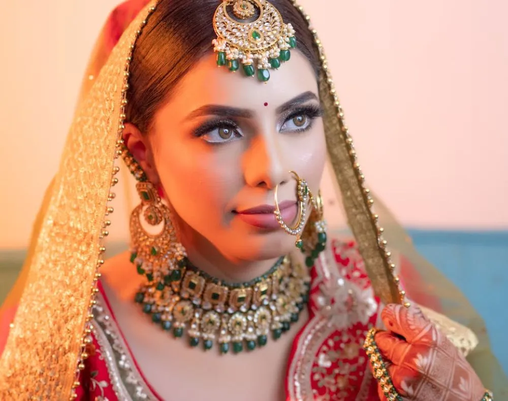 Flawless bridal makeup complements the outfit, jewelry, and hairstyle. Experts consider color coordination, fabric texture, and accessories when creating the bridal look.