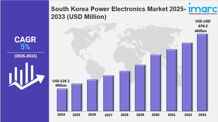The South Korea power electronics market size was valued at USD 628.2 Million in 2024 and is projected to reach USD 974.5 Million by 2033, growing at a CAGR of 5% during the forecast period of 2025–2033. This growth is driven by rising demand for electric vehicles, government support for renewable energy, expanding semiconductor production, investments in smart grids, upgrades in industrial automation, and increasing needs for efficient power management and energy-saving solutions.