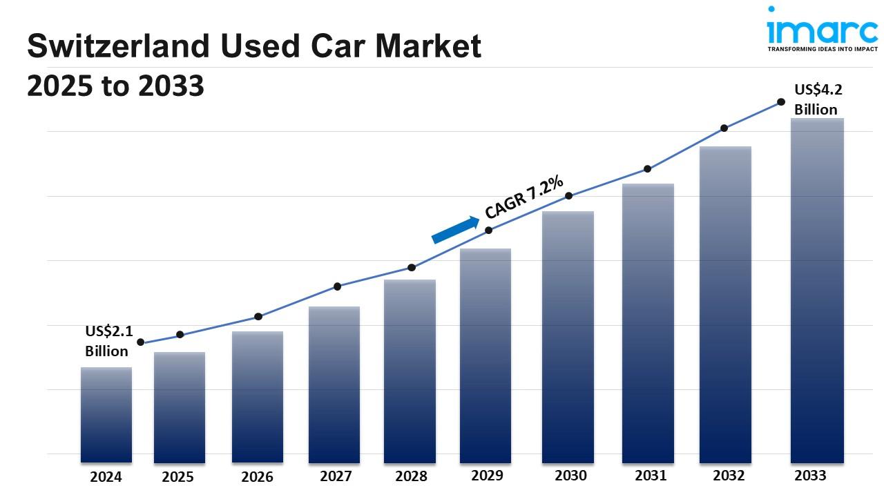 The Switzerland used car market was valued at USD 2.1 Billion in 2024 and is forecasted to reach USD 4.2 Billion by 2033, reflecting a CAGR of 7.2% during 2025-2033. Increasing new-car prices and rising demand for affordable mobility drive the market. Digital platforms and technological advancements like vehicle history reports enhance buyer confidence. Urban mobility needs and environmental awareness further boost interest in second-hand vehicles.