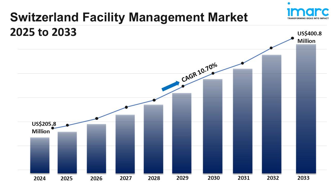 The Switzerland facility management market size was valued at USD 205.8 Million in 2024 and is projected to reach USD 400.8 Million by 2033. The market is expected to grow at a CAGR of 10.70% from 2025 to 2033, driven by sustainability initiatives, smart building technologies, and increased outsourcing. Companies are adopting eco-friendly practices and integrated IoT-based services to improve operational efficiency and reduce costs.