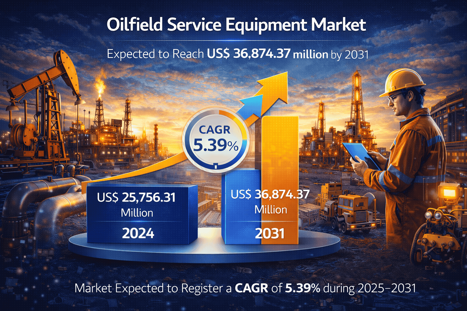 The oilfield service equipment market is entering a phase of steady and structurally supported growth, with revenues projected to rise from US$ 25,756.31 million in 2024 to US$ 36,874.37 million by 2031. This expansion reflects a forecast CAGR of 5.39 percent during the 2025 to 2031 period. For investors, this growth trajectory signals a market driven not only by cyclical oil price movements but also by long term fundamentals such as energy security, technological modernization, and the increasing complexity of upstream operations.
