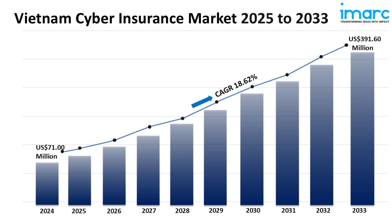 The Vietnam cyber insurance market size reached USD 71.00 Million in 2024 and is projected to grow to USD 391.60 Million by 2033, reflecting a CAGR of 18.62% from 2025 to 2033. Growth is driven by increasing cyberattacks, stringent data protection laws, rising digital adoption, and greater awareness of financial risk management among enterprises. This market expansion includes tailored insurance offerings from both local and international providers.