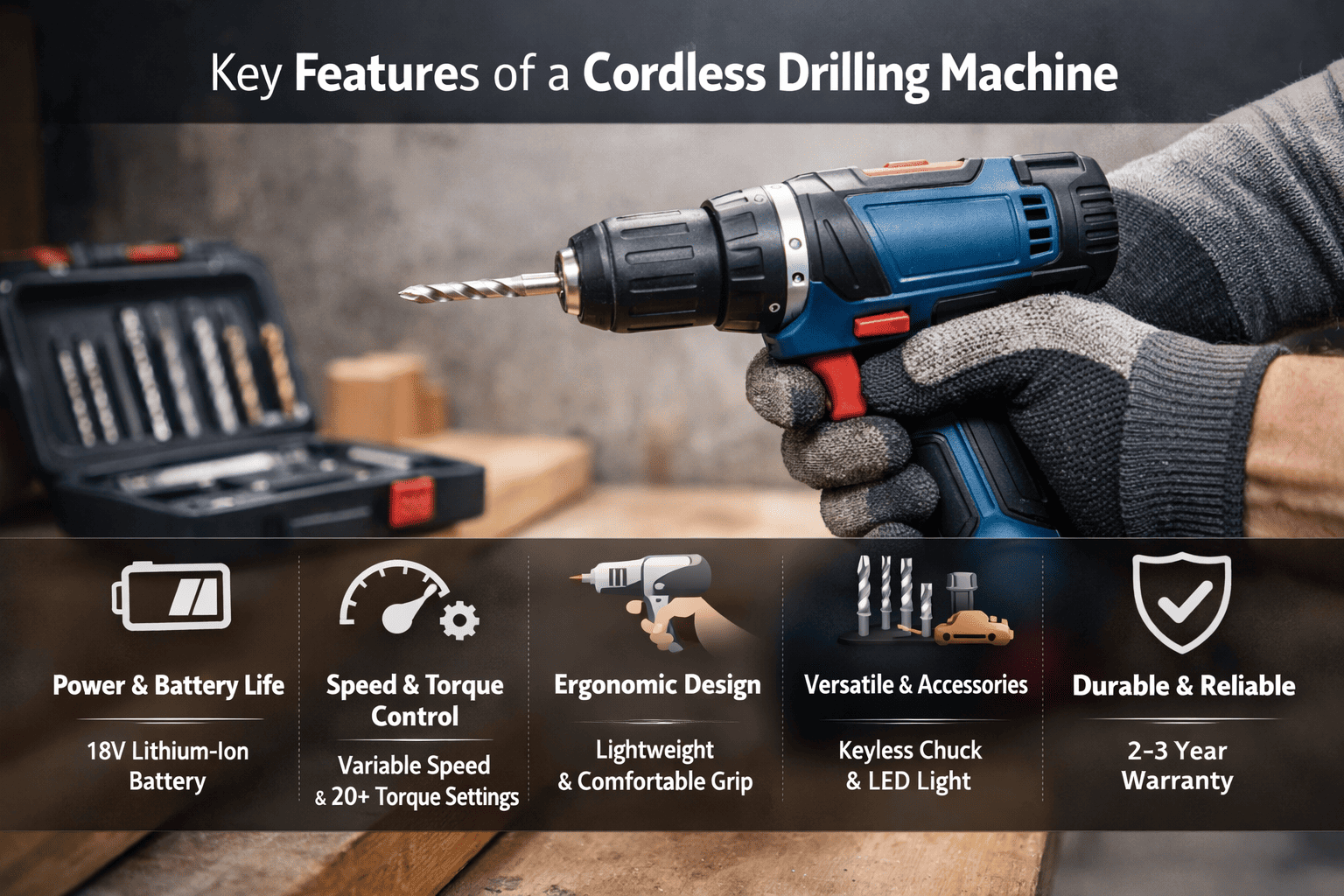 Modern cordless drilling machine often include additional functionality, such as acting as a screwdriver or accommodating multiple drill bits. Key features include keyless chucks for quick bit changes, built-in LED lights for working in dark areas, and accessory kits that provide extra batteries, cases, and drill bits for convenience.