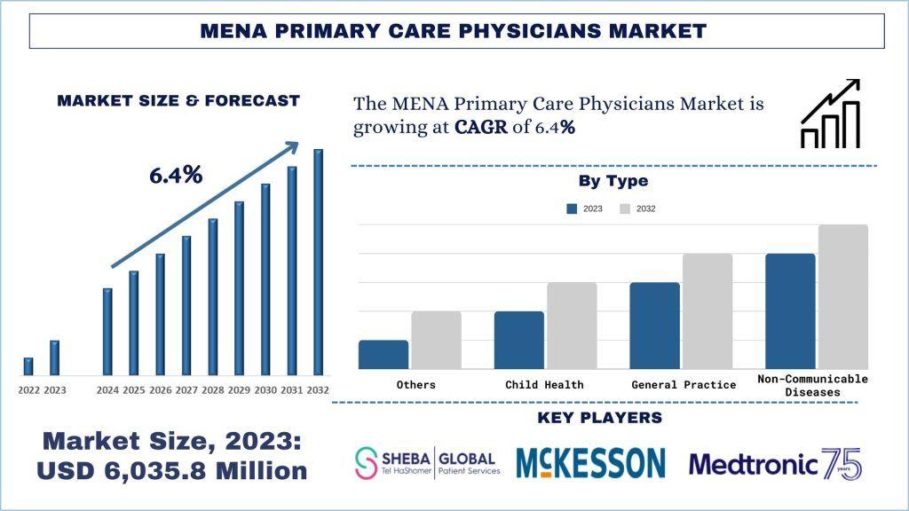 According to UnivDatos, the rising prevalence of chronic diseases across the Middle East and North Africa (MENA) region is a key factor driving demand for primary care services. As highlighted in the “MENA Primary Care Physicians Market” report, the market was valued at USD 6,035.82 million in 2023 and is expected to grow at a CAGR of 6.4% during the forecast period from 2024 to 2032, reaching USD million by 2032.