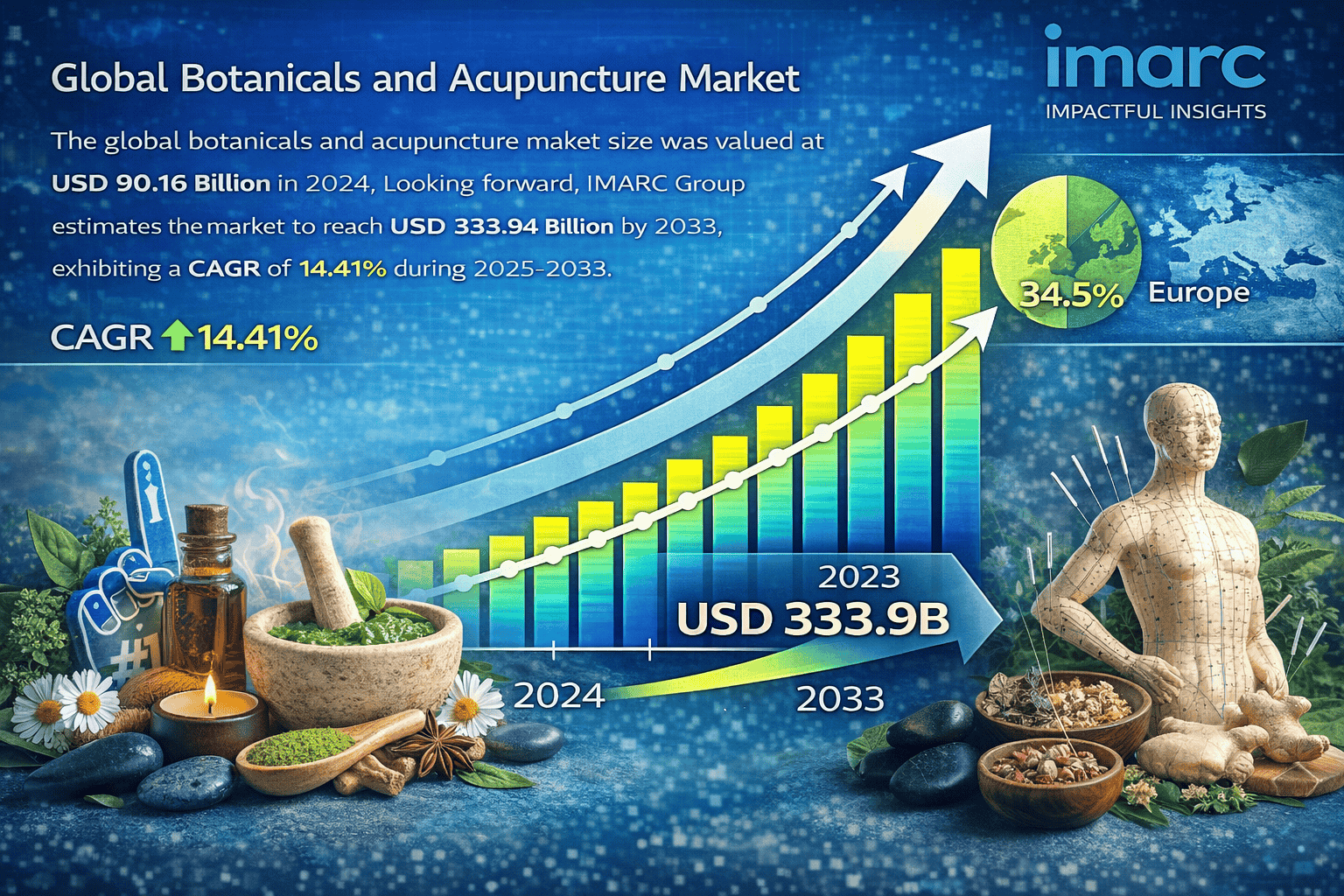 The global botanicals and acupuncture market reached a value of USD 90.16 Billion in 2024 and is projected to grow to USD 333.94 Billion by 2033, expanding at a CAGR of 14.41% during the forecast period 2025–2033. Market growth is primarily driven by rising consumer demand for natural and alternative healthcare solutions, owing to their perceived safety, efficacy, and minimal side effects. Europe dominates the market with a share of over 34.5%, supported by strong adoption of preventive healthcare practices and natural therapies. For more details, visit the Botanicals and Acupuncture Market.