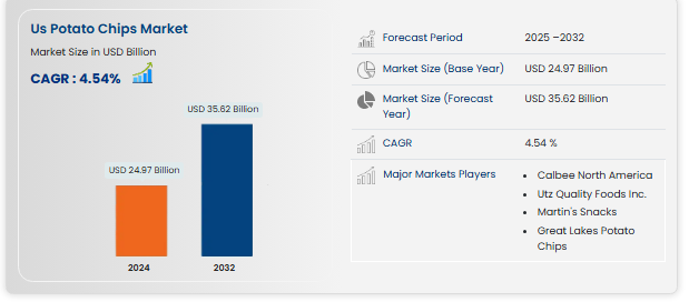 The U.S. potato chips market size was valued at USD 24.97 billion in 2024 and is expected to reach USD 35.62 billion by 2032, at a CAGR of 4.54% during the forecast period