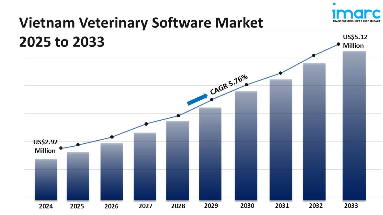 The Vietnam veterinary software market size reached USD 2.92 Million in 2024 and is projected to reach USD 5.12 Million by 2033. It is expected to grow at a CAGR of 5.76% during the forecast period 2025-2033. This growth is driven by government-led digital transformation initiatives, rapid expansion in pet ownership, and widespread adoption of cloud-based and telemedicine veterinary software solutions. The increasing modernization of veterinary services enhances the demand for advanced software management tools in the Vietnamese market.