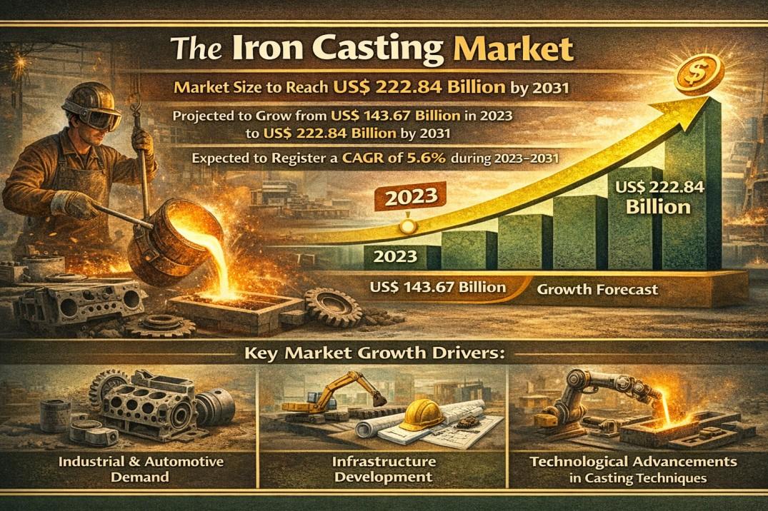 The iron casting market size is projected to reach US$ 222.84 billion by 2031, growing from US$ 143.67 billion in 2023. The market is expected to register a CAGR of 5.6 percent during 2023 to 2031. This steady growth is supported by rising automotive production, increasing construction spending, and technological improvements in foundry operations that enhance efficiency and product quality.