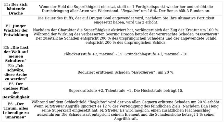 e6 vereint die Effekte von e1 und e2, indem es sowohl die unterstützenden Funktionen des Charakters stärkt als auch seine Rolle als sekundärer Schadensausteiler (DD) optimiert.