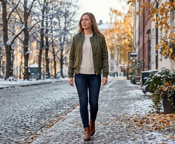 The danger with winter layers is looking like a walking pile of laundry. The key is playing with proportions. If your bomber is puffy and oversized (which is very trendy right now), keep your bottom half streamlined. Think fitted leather pants, thick tights with a skirt, or skinny jeans tucked into knee-high boots.