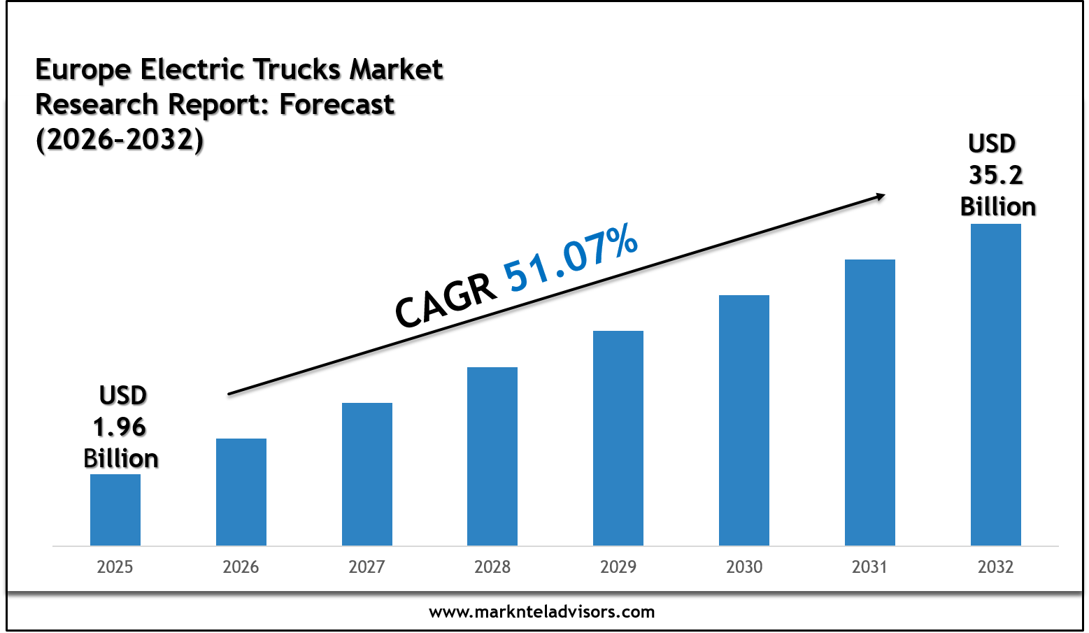 The Europe Electric Trucks Market size is valued at around USD 1.96 billion in 2025 and is projected to reach USD 35.2 billion by 2032. Along with this, the market is estimated to grow at a CAGR of around 51.07% during the forecast period, i.e., 2026-32. The market is experiencing significant growth as governments, manufacturers, and logistics operators work to meet the region's decarbonization targets. The market growth receives its main promotional force from EU emission standards, which require heavy-duty vehicles to reduce their CO2 output by 90% before 2040. The regulatory push has forced Volvo Trucks and Daimler to speed up their zero-emission truck fleet development, which includes the Volvo FH Electric that operates in Germany and the Netherlands..