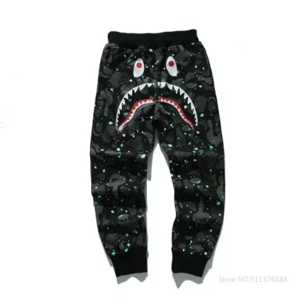 One of the most striking examples of BAPE’s artistry in pants design is the Shark motif. Inspired by the brand’s famous shark hoodie, BAPE Shark Pants feature fierce, graphic designs along the legs or near the pockets — often incorporating shark teeth or eyes. These pants are not subtle; they are bold statements. They transform everyday clothing into wearable art. The design captures the essence of what makes BAPE beautiful — a fearless fusion of playfulness and power.