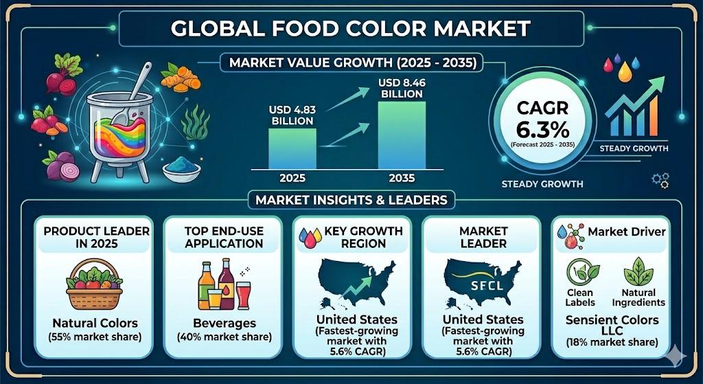 NEWARK, Del., USA | April 9, 2026 — According to the latest market analysis by Future Market Insights, the global food color market is witnessing robust expansion, driven by increasing demand for clean-label products, rising consumer preference for natural ingredients, and the growing application of colorants across food and beverage categories. The market is projected to grow from USD 4.83 billion in 2025 to USD 8.46 billion by 2035, registering a CAGR of 6.3% during the forecast period.