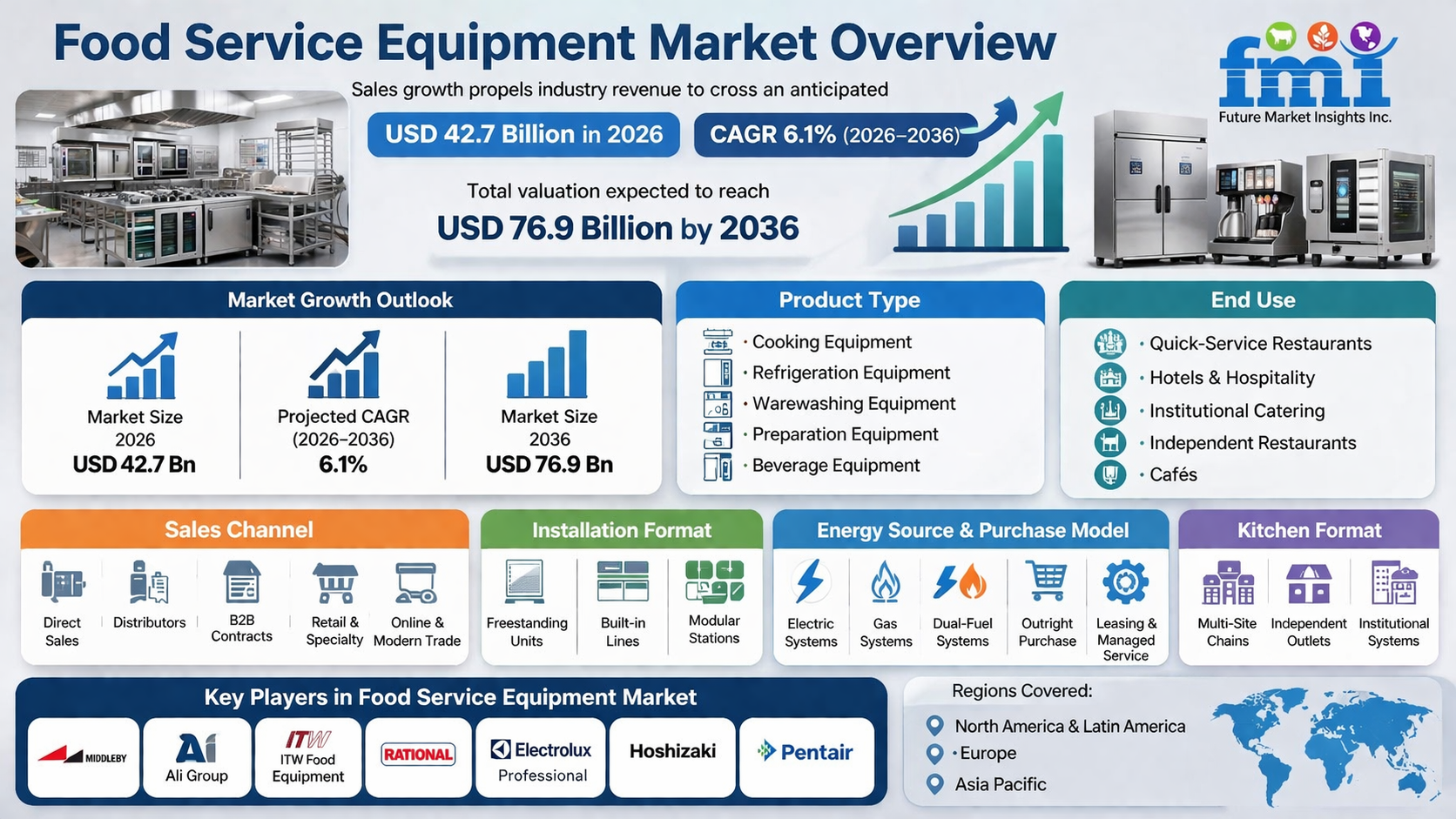 NEWARK, Del., USA | April 10, 2026 — According to the latest market analysis by Future Market Insights (FMI), the global food service equipment market is set for steady expansion, driven by increasing outlet penetration, modernization of commercial kitchens, and rising demand for energy-efficient and automated systems. The market, valued at USD 40.2 billion in 2025, is projected to reach USD 42.7 billion in 2026 and further expand to USD 76.9 billion by 2036, registering a CAGR of 6.1% during the forecast period.