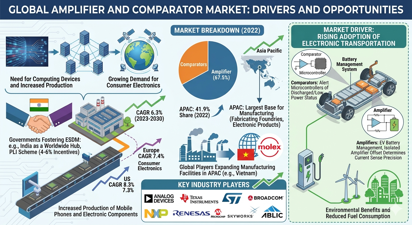 The growing complexity of electronic systems across industries is expected to sustain the demand for amplifier and comparator technologies in the coming years. These components remain essential for signal amplification, voltage comparison, and system monitoring in modern electronic circuits.