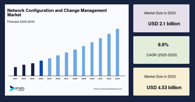 The global Network Configuration and Change Management Market is experiencing steady growth, driven by the increasing complexity of IT infrastructures and the rising need for automated network management solutions. According to the latest report by Straits Research, the market was valued at USD 2.1 billion in 2024 and is projected to grow from USD 2.29 billion in 2025 to reach USD 4.53 billion by 2033, registering a compound annual growth rate (CAGR) of 8.9% during the forecast period.