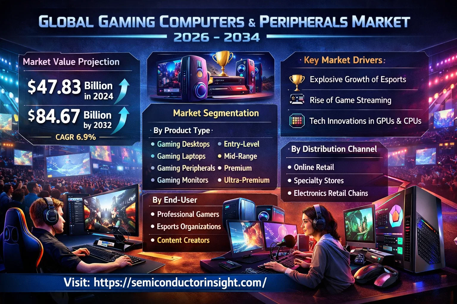 Global Gaming Computers and Peripherals Market, valued at a substantial USD 47.83 billion in 2024, is positioned for remarkable expansion, projected to reach USD 84.67 billion by 2032. This growth trajectory, representing a compound annual growth rate (CAGR) of 6.9% during the forecast period 2026-2035, is detailed in a comprehensive new report published by Semiconductor Insight. The study underscores the pivotal role of high-performance computing hardware and specialized peripherals in enabling immersive gaming experiences and supporting the rapidly evolving esports ecosystem.