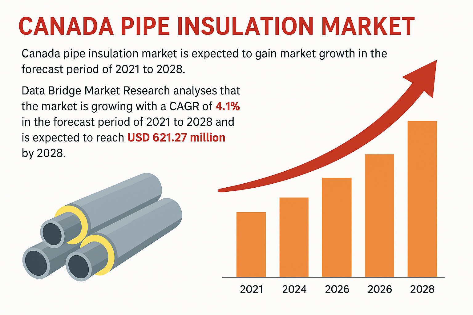 Canada pipe insulation market is expected to gain market growth in the forecast period of 2021 to 2028. Data Bridge Market Research analyses that the market is growing with a CAGR of 4.1% in the forecast period of 2021 to 2028 and is expected to reach USD 621.27 million by 2028.