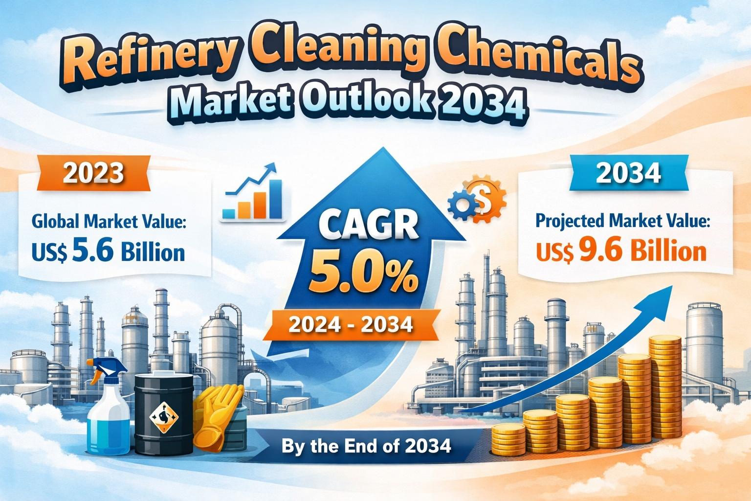 According to industry estimates, the global refinery cleaning chemicals market was valued at US$ 5.6 billion in 2023 and is projected to reach US$ 9.6 billion by 2034, expanding at a CAGR of 5.0% during the forecast period. This growth reflects the convergence of industrial expansion, regulatory pressures, and continuous advancements in chemical technologies.