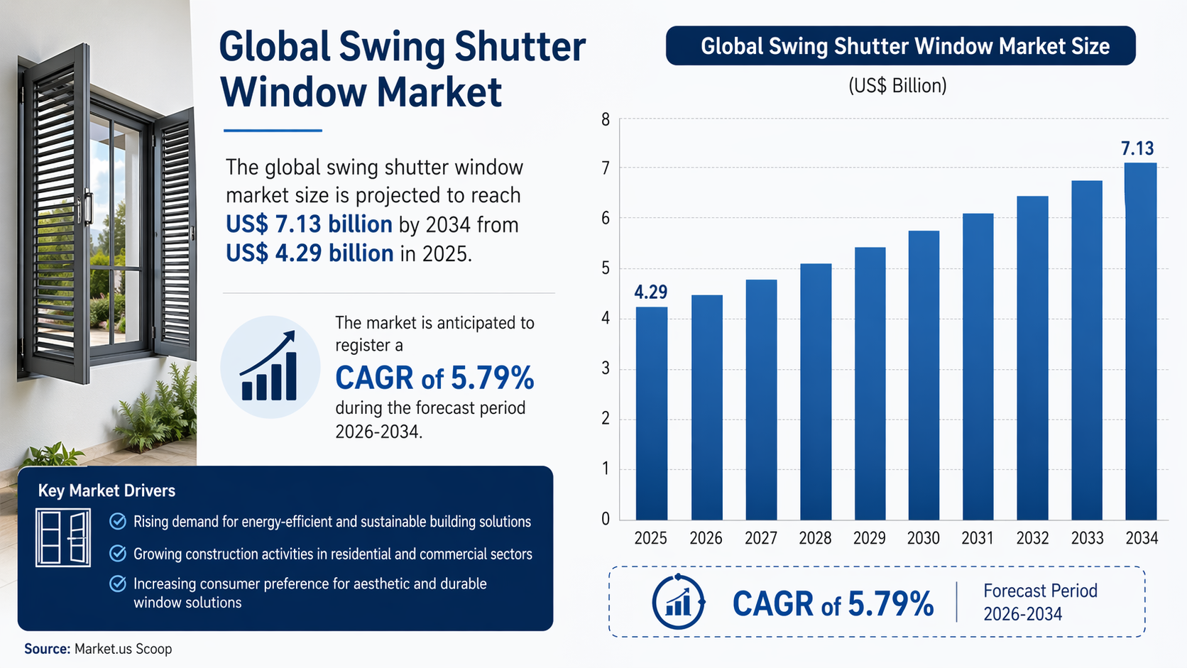 The industry is currently witnessing a period of steady financial expansion. According to recent industry data, the global swing shutter window market size is projected to reach US$ 7.13 billion by 2034 from US$ 4.29 billion in 2025. The market is anticipated to register a CAGR of 5.79% during the forecast period 2026-2034. This growth is largely attributed to the increasing volume of residential construction projects and the rising demand for aesthetically pleasing window treatments that do not compromise on durability or thermal performance.