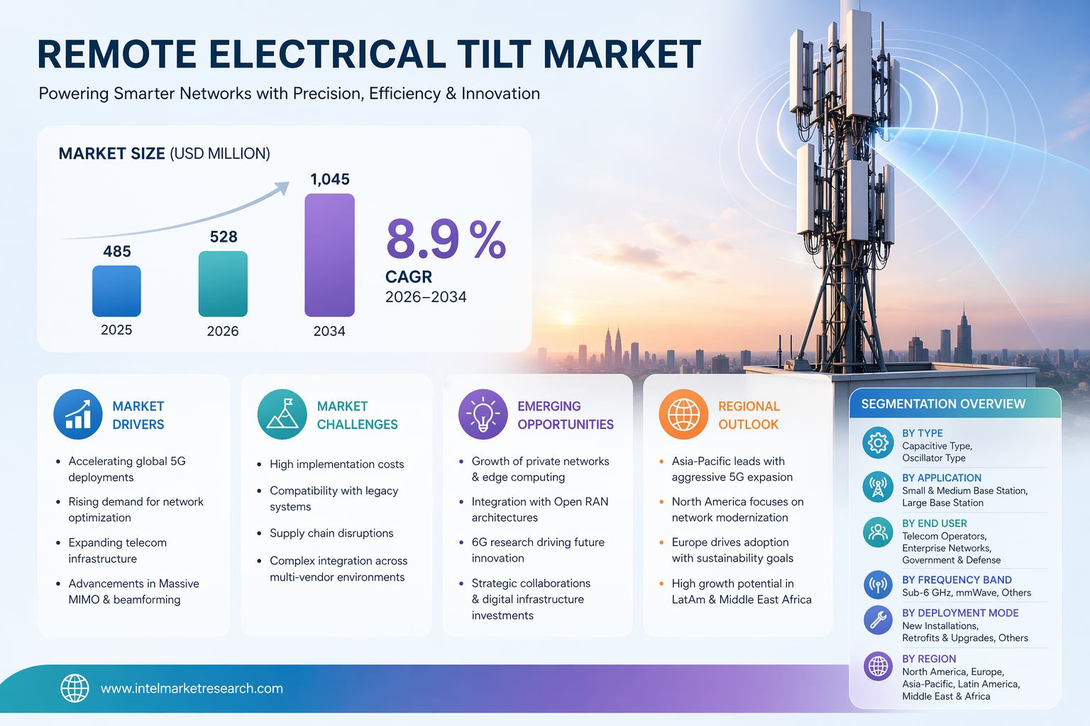 According to a new report from Intel Market Research, the global Remote Electrical Tilt market was valued at USD 485 million in 2025 and is projected to grow from USD 528 million in 2026 to USD 1,045 million by 2034, exhibiting a CAGR of 8.9% during the forecast period (2026–2034). This growth is propelled by the global 5G rollout, surging demand for network optimization, expanding telecom infrastructure, and advancements in Massive MIMO and beamforming technologies.