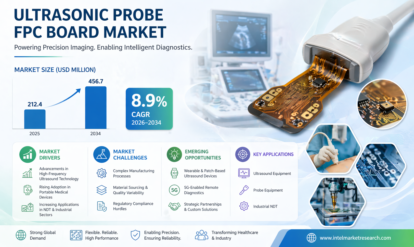 According to a new report from Intel Market Research, the global Ultrasonic Probe FPC Board market was valued at USD 212.4 million in 2025 and is projected to reach USD 456.7 million by 2034, growing at a robust CAGR of 8.9% during the forecast period (2026–2034). This growth is propelled by rising adoption of advanced ultrasound systems, demand for miniaturized probes, expansion in healthcare imaging, innovations in flexible electronics, and increasing NDT applications.