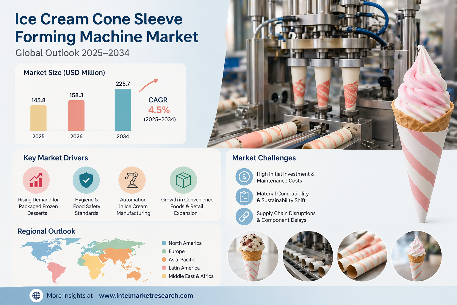 According to a new report from Intel Market Research, the global Ice Cream Cone Sleeve Forming Machine market was valued at USD 145.8 million in 2025 and is projected to grow from USD 158.3 million in 2026 to USD 225.7 million by 2034, exhibiting a CAGR of 4.5% during the forecast period (2025–2034). This growth is propelled by rising global consumption of packaged frozen desserts, heightened hygiene standards in food service industries, and accelerating adoption of automation technologies across ice cream manufacturing operations worldwide.