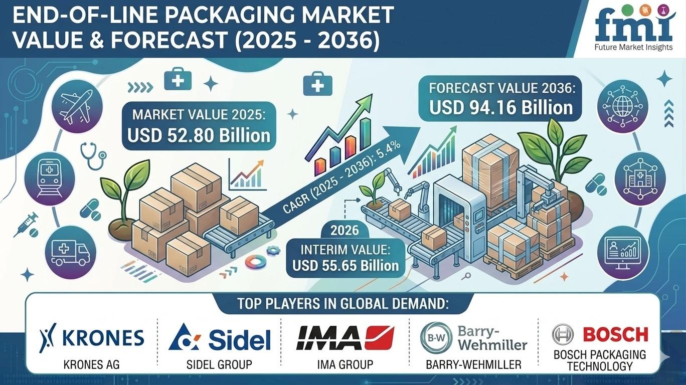 According to latest analysis by Future Market Insights, the global end-of-line packaging market is projected to grow from USD 55.65 billion in 2026 to USD 94.16 billion by 2036, expanding at a CAGR of 5.4%. Growth is primarily driven by rising automation adoption, increasing e-commerce fulfilment volumes, and labor shortages across manufacturing and logistics operations.