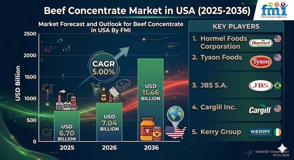 NEWARK, Del., USA | April 23, 2026 According to Future Market Insights (FMI), the demand for beef concentrate in the USA is projected to grow from USD 7.04 billion in 2026 to USD 11.46 billion by 2036, registering a CAGR of 5.0%. Growth is being driven by the rising adoption of bone broth as a functional health beverage, increasing demand for high-protein diets, and expanding use in food processing and ready-to-eat meals.