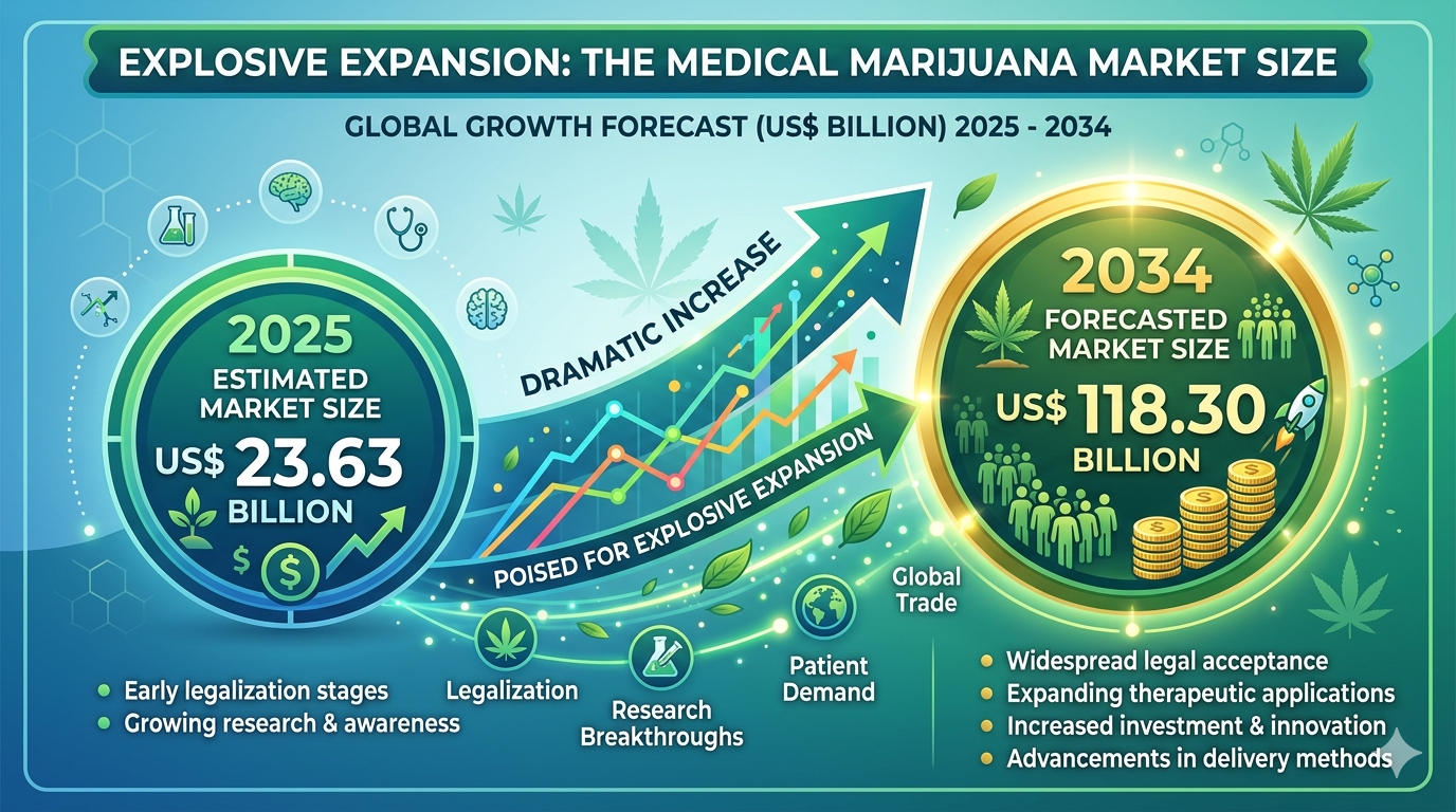 The global Medical Marijuana Market size is poised for explosive expansion, expected to reach US$ 118.30 billion by 2034, a dramatic increase from US$ 23.63 billion in 2025. The market is anticipated to register an exceptional Compound Annual Growth Rate (CAGR) of 19.64% during the forecast period of 2026–2034. This remarkable growth trajectory is driven by increasing legalization across various countries, rising demand for alternative therapies, and expanding research initiatives focused on cannabis-based medicines. Additionally, supportive government policies and growing healthcare investments are further accelerating the adoption of medical marijuana worldwide.