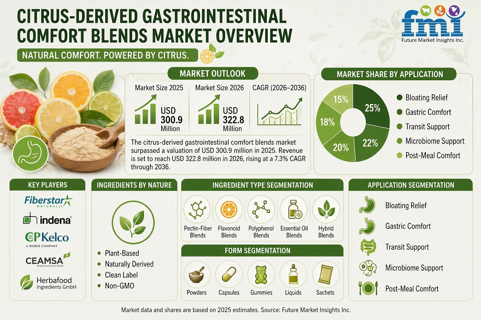 NEWARK, Del., USA | April 24, 2026 — According to the latest market analysis by Future Market Insights (FMI), the global citrus-derived gastrointestinal comfort blends market is set for steady expansion, supported by rising demand for plant-based digestive health solutions, improved formulation stability, and increasing adoption in nutraceutical and functional wellness products.