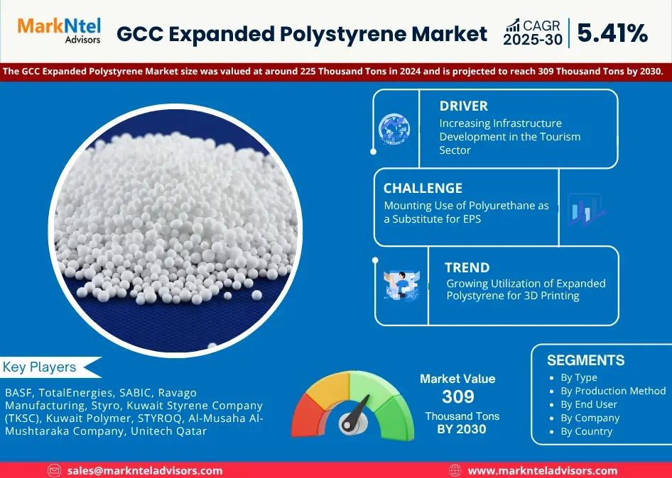According to MarkNtel Advisors study The GCC Expanded Polystyrene Market size was valued at around 225 Thousand Tons in 2024 and is projected to reach 309 Thousand Tons by 2030. Along with this, the market is estimated to grow at a CAGR of around 5.41% during the forecast period, i.e., 2025-30.