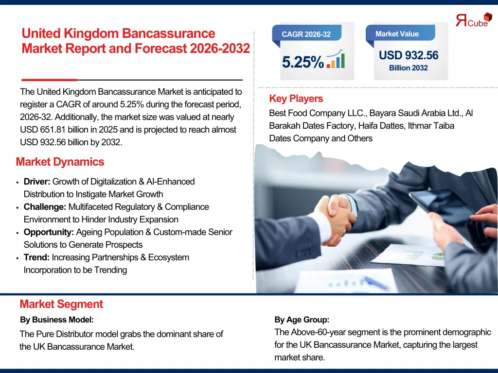 The United Kingdom Bancassurance Market is anticipated to register a CAGR of around 5.25% during the forecast period, 2026-32. Additionally, the market size was valued at nearly USD 651.81 billion in 2025 and is projected to reach almost USD 932.56 billion by 2032. The expansion of the industry is being driven by multiple interlinked aspects, particularly the surging digitalization of banking & insurance services, demographic changes, and developing consumer preferences.