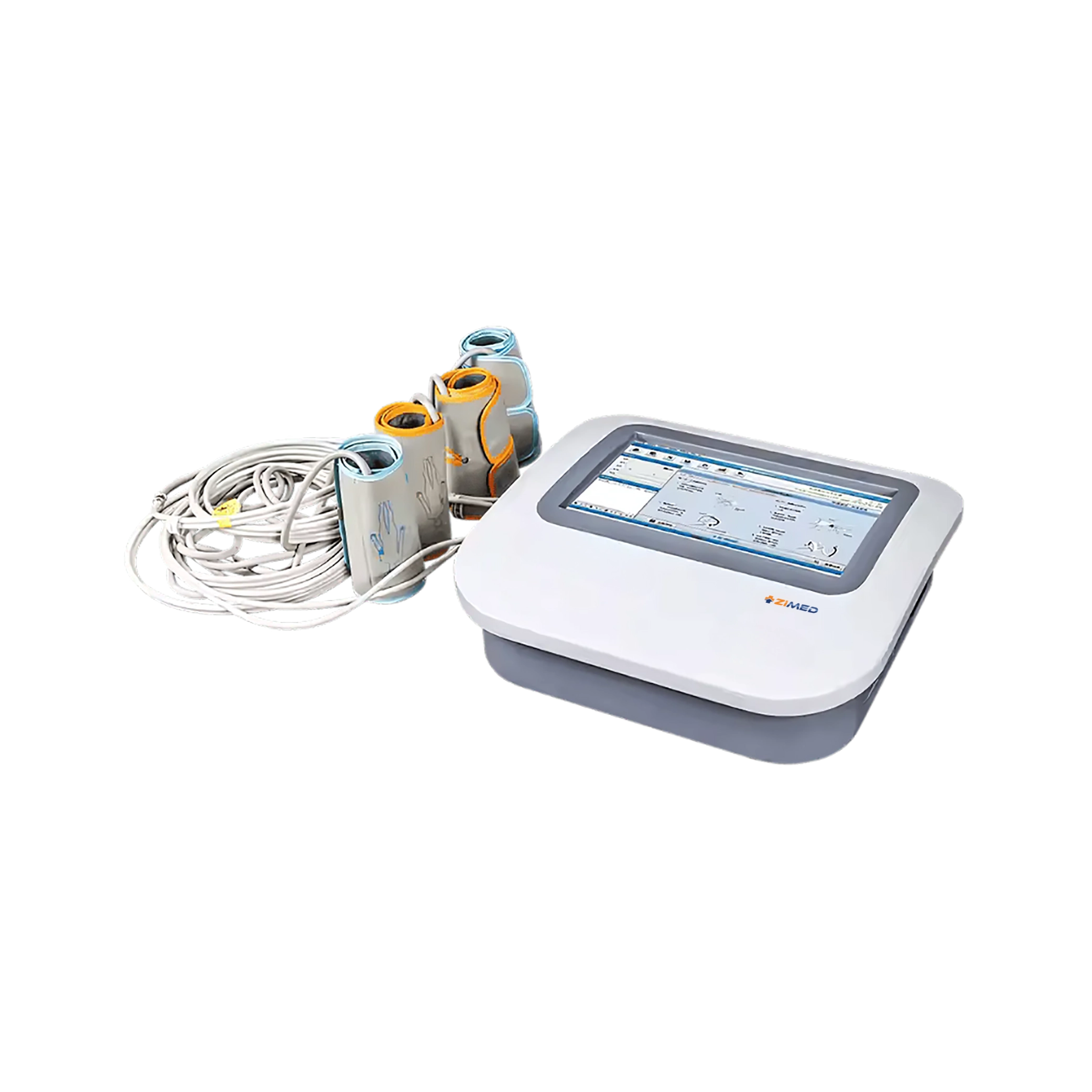Zimed Arteriosclerosis Detector delivers oscillography-based hemodynamic profiling with synchronized limb pressurization. Quad BP modules with pulse analytics cover 40–199 BPM. Dual-index risk stratification, adaptive calibration, and data connectivity ensure accurate and reliable diagnostic reports.