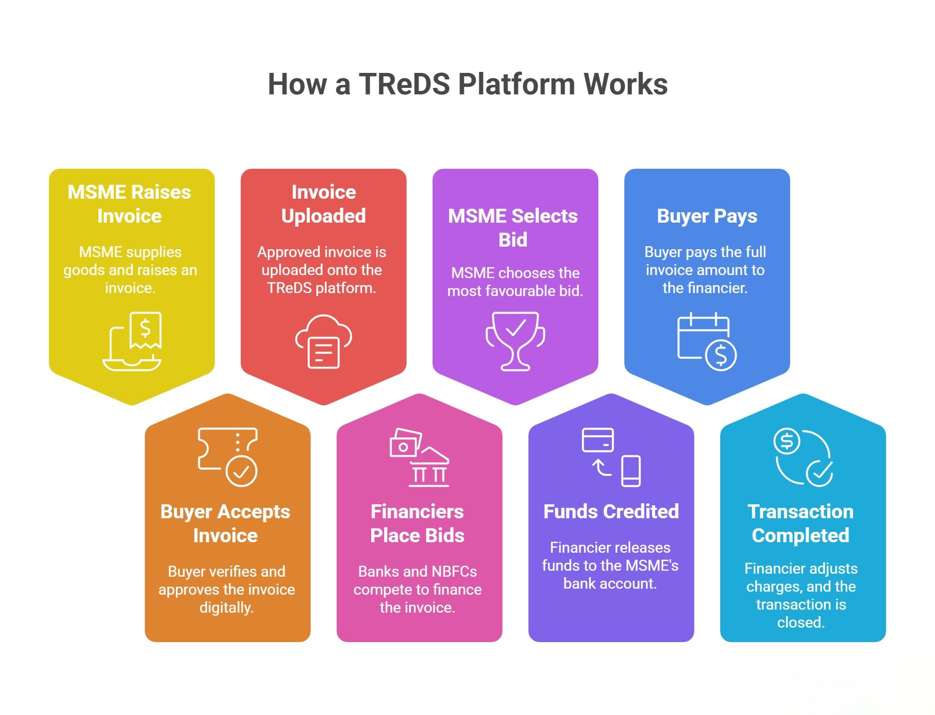 A TReDS platform helps MSMEs convert approved invoices into immediate working capital through a transparent, RBI-regulated process. Once a buyer accepts the invoice, multiple financiers bid, ensuring competitive rates and faster funding. Platforms like RXIL enable MSMEs to unlock liquidity without collateral, improve cash flow, and reduce dependence on traditional loans—making invoice financing secure, digital, and efficient for growing businesses.
