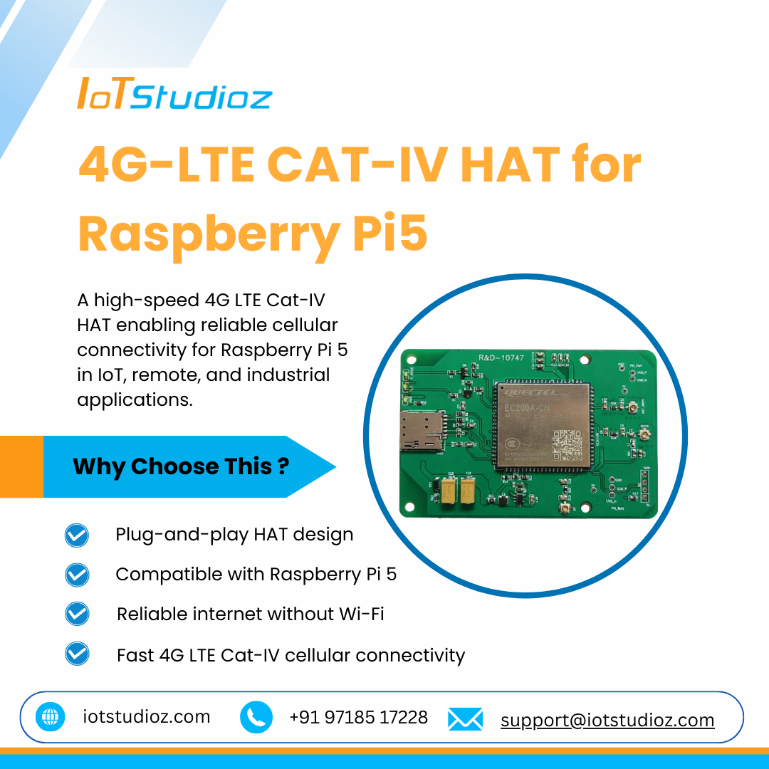 Enhance your Raspberry Pi 5 with a high-performance 4G LTE Cat-IV HAT. Supporting fast mobile data, IoT deployments, and industrial applications, it delivers reliable connectivity, easy setup, and compatibility with multiple networks, making it perfect for projects that require constant online access.